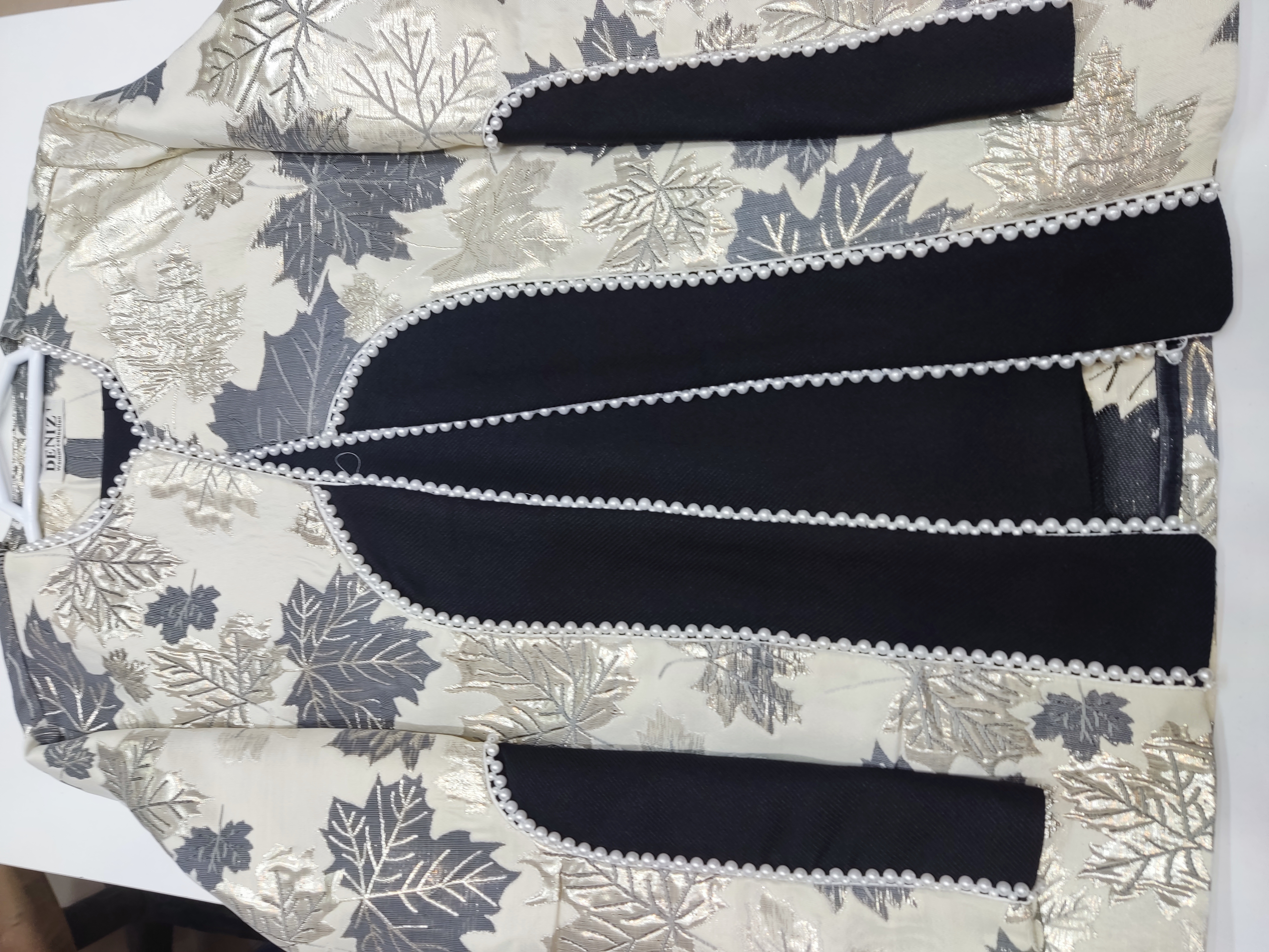 یقه کت گرد و مروارید کار شده است